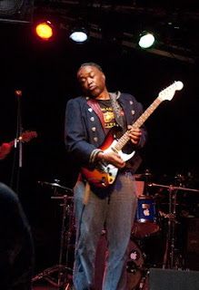Whatcha gonna do? For sure you don't want to be blasting your guitar heros with blazes of light from your mega watts on board shoe mounted studio lighting system. Rude boys might; I turn off the flash and go available light. Since most clubs are sinfully dimly lit you're going to need to set your camera to wide open, the largest aperture available. You can do this by setting the camera to aperture mode 'A', and selecting the smallest aperture available (f 3.8 - 5.6 on my Nikon 18-200 zoom). The camera will then set the correct shutter speed for you to get a good exposure. But that guitar playing is slinking around and wailing on the guitar, remember. He's going to be blurred for sure, especially those lightening fast picking and fretting hands, so you need enough speed for the shutter to stop the action. To do that you'll have to pump your camera's iso to it's highest rating (iso 1600 or higher). Wait a minute. Doesn't that creat a lot of noise in the photo? Yes it does. You can reduce it by using a noise reducing program in post production (you know, after you take the picture and it's in your computer and you fix it up)like Noise Ninja, or you can look at it like I do that the noise is just part of the arty look, like my old grainy high speed film b&w photos.
